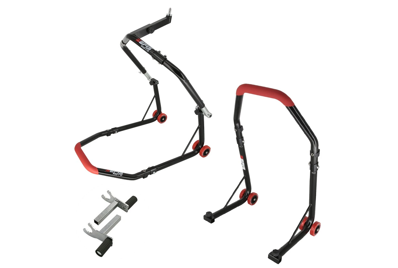 U zadního stojanu máte na výběr ze tří typů adaptérů: Háky pro motocykly s rolnami, packy pro motocykly, které je třeba zvedat přímo za kyvnou vidlici a 2v1 které lze zároveň použit jako single přední adaptéry pro motocykly s radiálními brzdiči. Pro nastavení šířky stojanu jsou adaptéry polohovatelné do stran. Pokud by to bylo pro nezvykle úzké nebo široké motocykly málo, samotný stojan lze opřením o zem rukama stlačit nebo roztáhnout až o dalších 5 centimetrů, aniž by došlo k jakémukoli poškození.