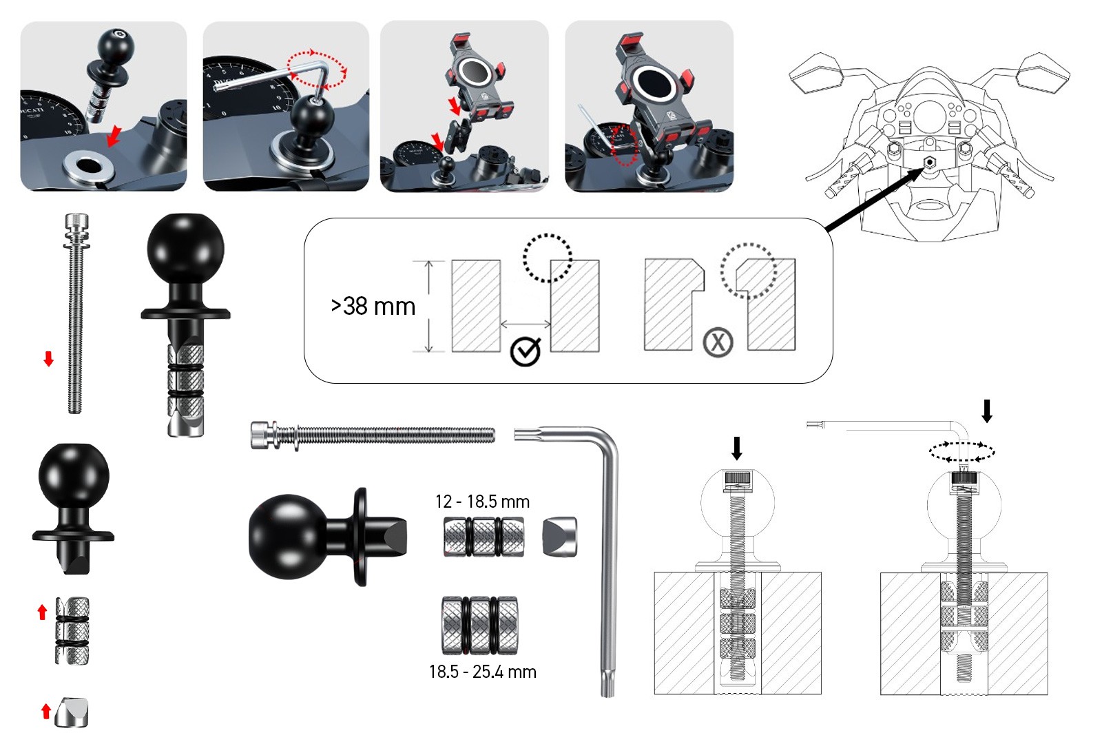 • s adaptérem S-ball pro instalaci do otvoru krku řízení o velikosti 12 – 25.4 milimetrů