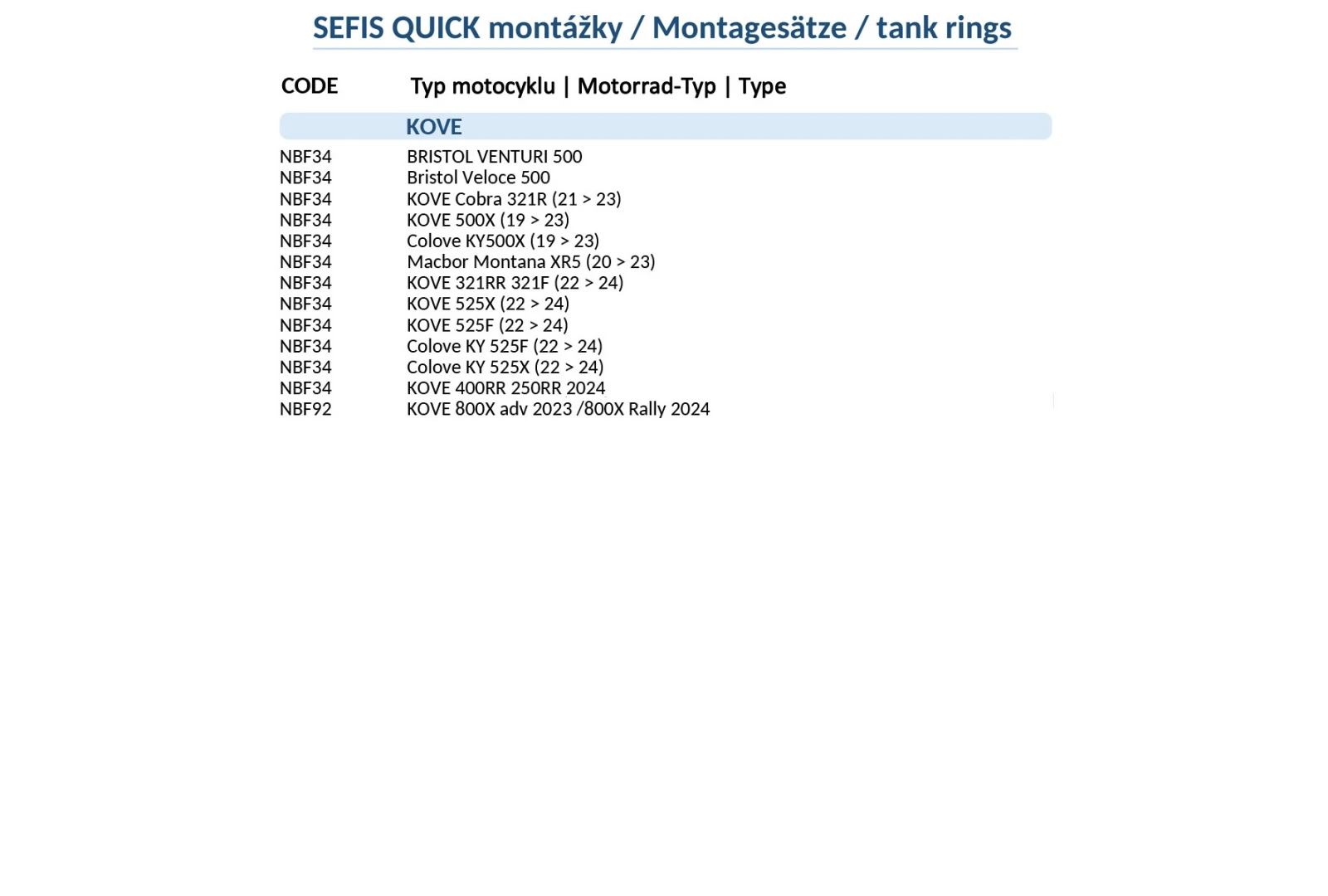 Brašna SEFIS Quick vyniká svým pevným, bezpečným a zároveň velmi praktickým uchycením na nádrž motocyklu. Díky rychloupínacímu systému brašnu během několika málo vteřin nasadíte a bezpečně zajistíte. Brašnu tak nasadíte i sejmete stejně rychle a pohodlně jako u magnetických brašen, ale zároveň s bezpečím a jistotou brašny pevně přichycené k nádrži. I samotná instalace je velmi jednoduchá a provádí se adaptérem pro specifický typ motocyklu, seznam kompatibilních motocyklů naleznete v tabulce na konci galerie.